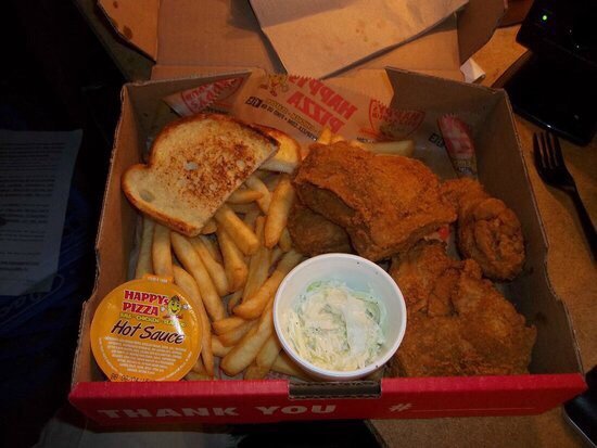 Legs, breasts, wings and thighs. Served with fries and featured bread.