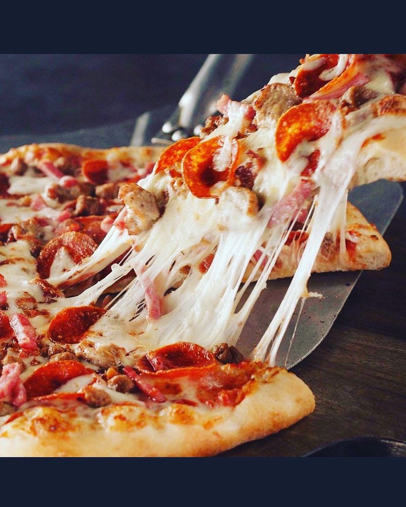 Pepperoni, ham, bacon, onions, mushrooms, green peppers, provolone cheese and pizza sauce.
