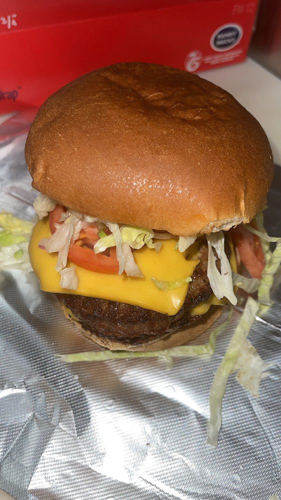 1/3 lb. fresh beef patty topped with lettuce, tomato, pickles, red onions, cheese, mustard, ketchup and mayo. Add bacon and extra beef patty for an additional charge.